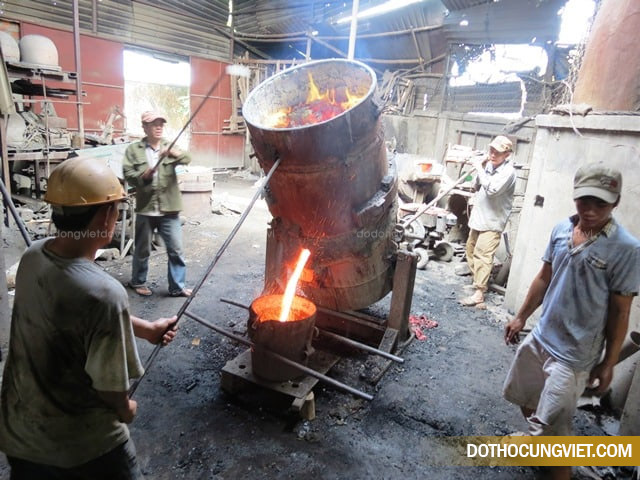 Nấu đồng ở nhiệt độ 1200 độ C, khi đồng chảy hết pha tỷ lệ Thiếc + Chì + Kẽm theo yêu cầu, chỉnh nhiệt độ la 1250 độ C, nước đồng lỏng đạt theo yêu cầu lúc đó đưa ra và rót vào khuôn.