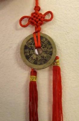 Trong phong thủy, đồng xu in hình Bát Quái là biểu tượng của sự giàu có, phát về tài lộc nhất là khi được kết bằng chỉ lụa đỏ. Đồng xu thường dùng là đồng tiền thời vua Càn Long có 2 mặt âm – dương thể hiện nguyên lý âm – dương hài hòa. Tiền hình tròn tượng trưng cho trời, ở giữa có lỗ vuông tượng trưng cho đất. Trên đồng tiền có in hình Bát Quái thể hiện đạo lý thiên – địa – nhân tương hợp tất tạo phúc và hưởng phú quý.